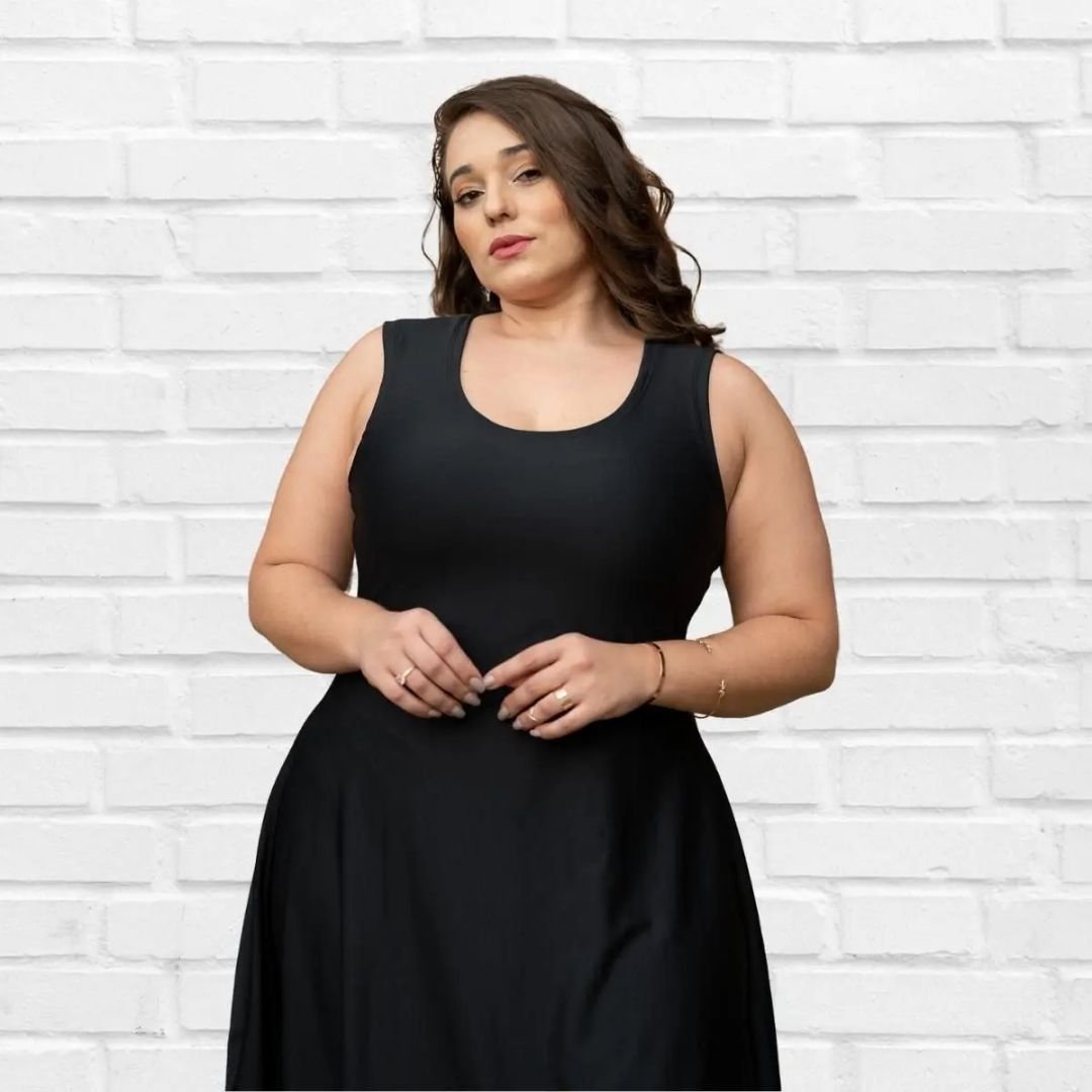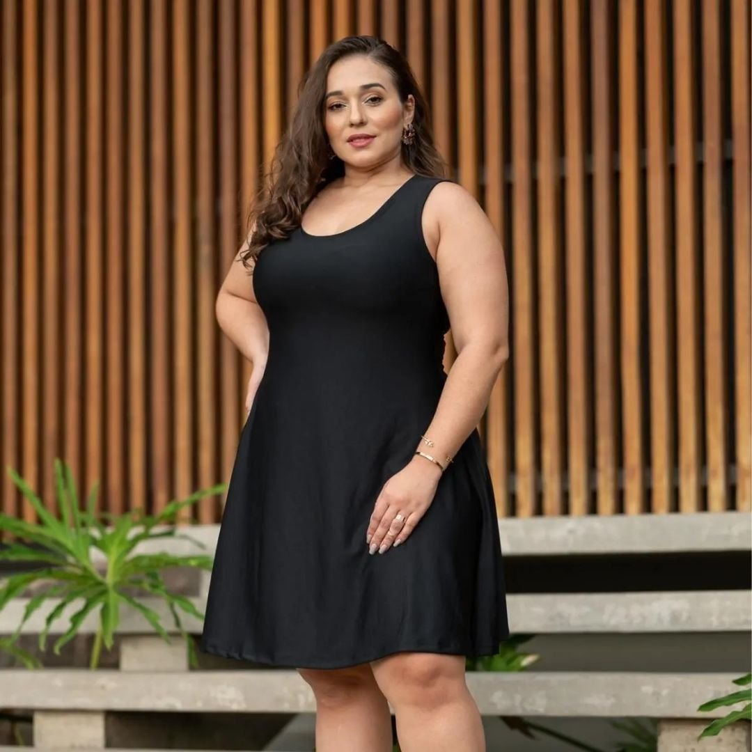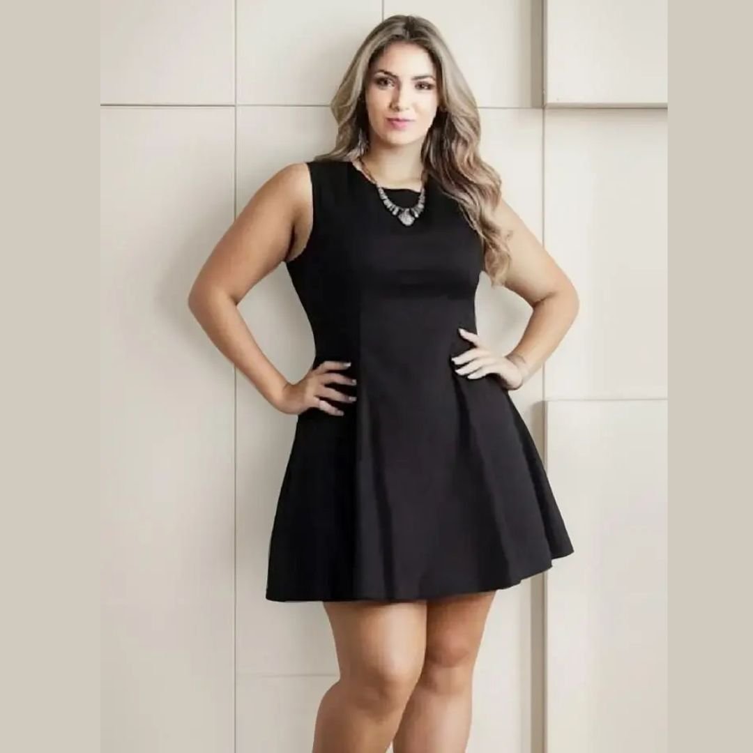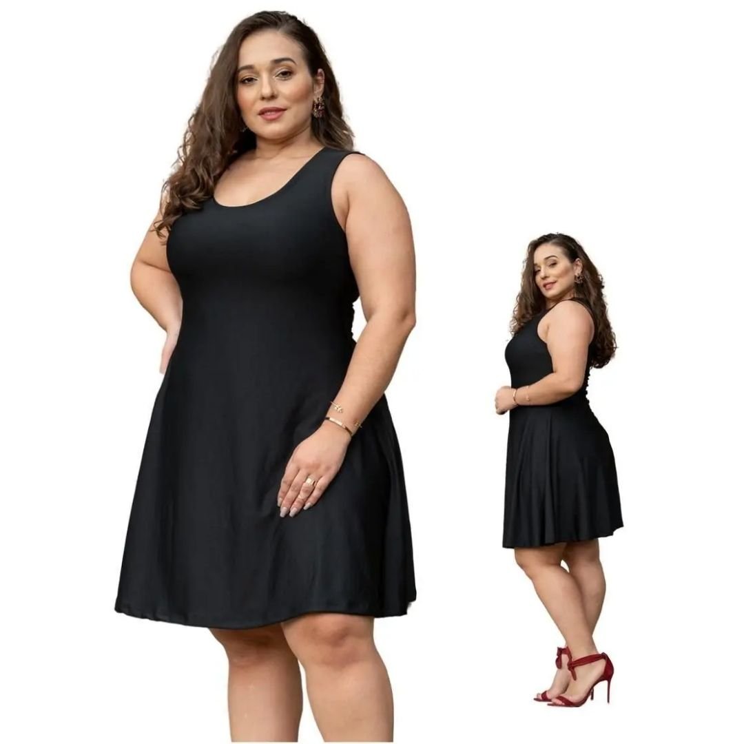 Vestido plus size feminino evasê rodado, ideal para festa e balada. Elegante, confortável e com ótimo caimento em tamanhos grandes.